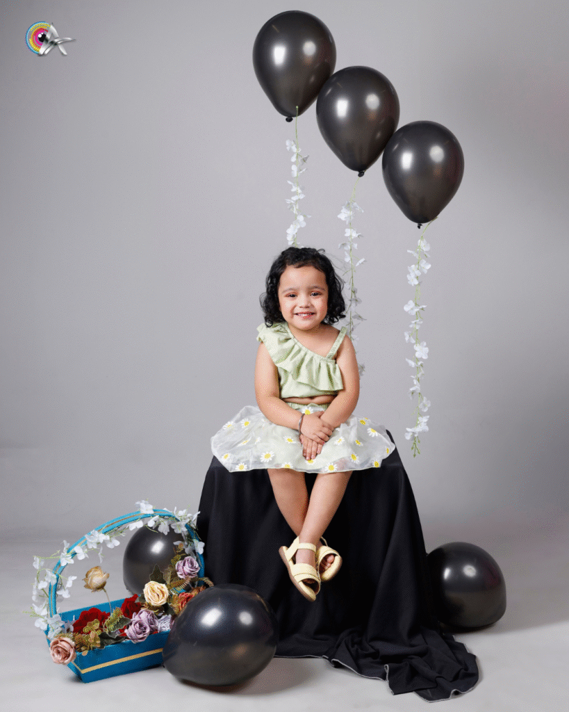 Little girl in a pastel blue party gown posing gracefully against a gray studio background.